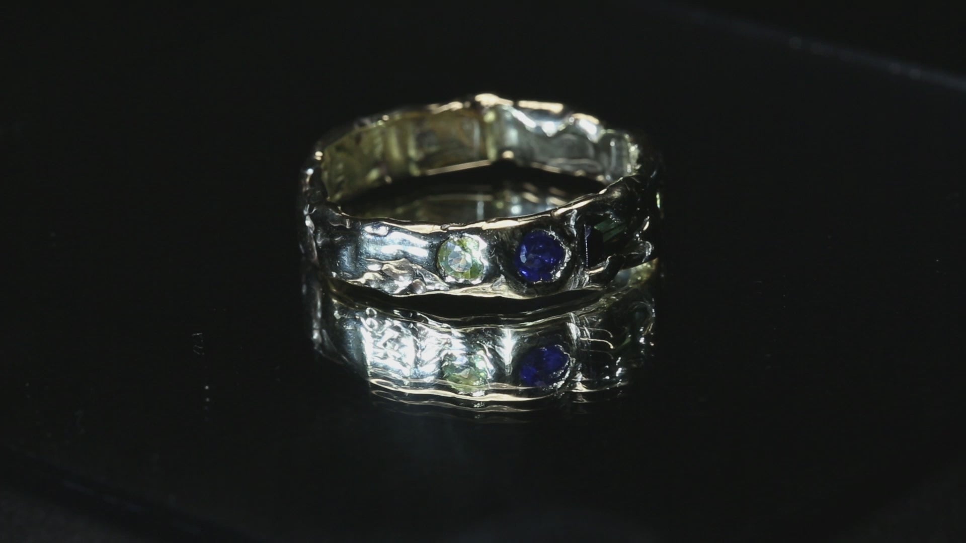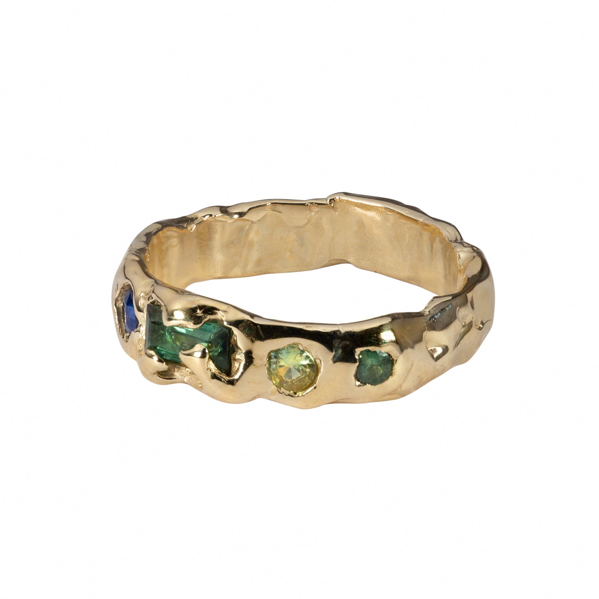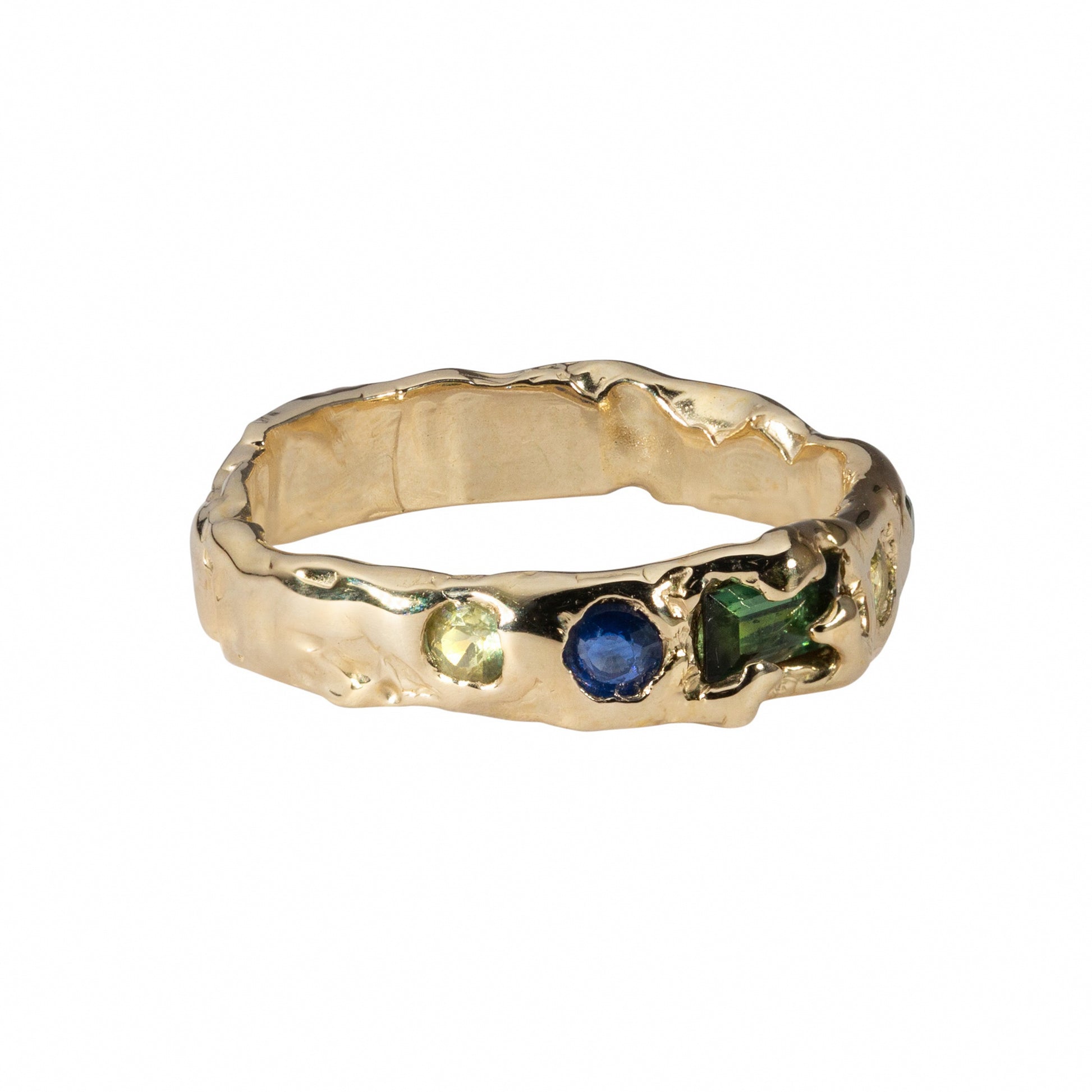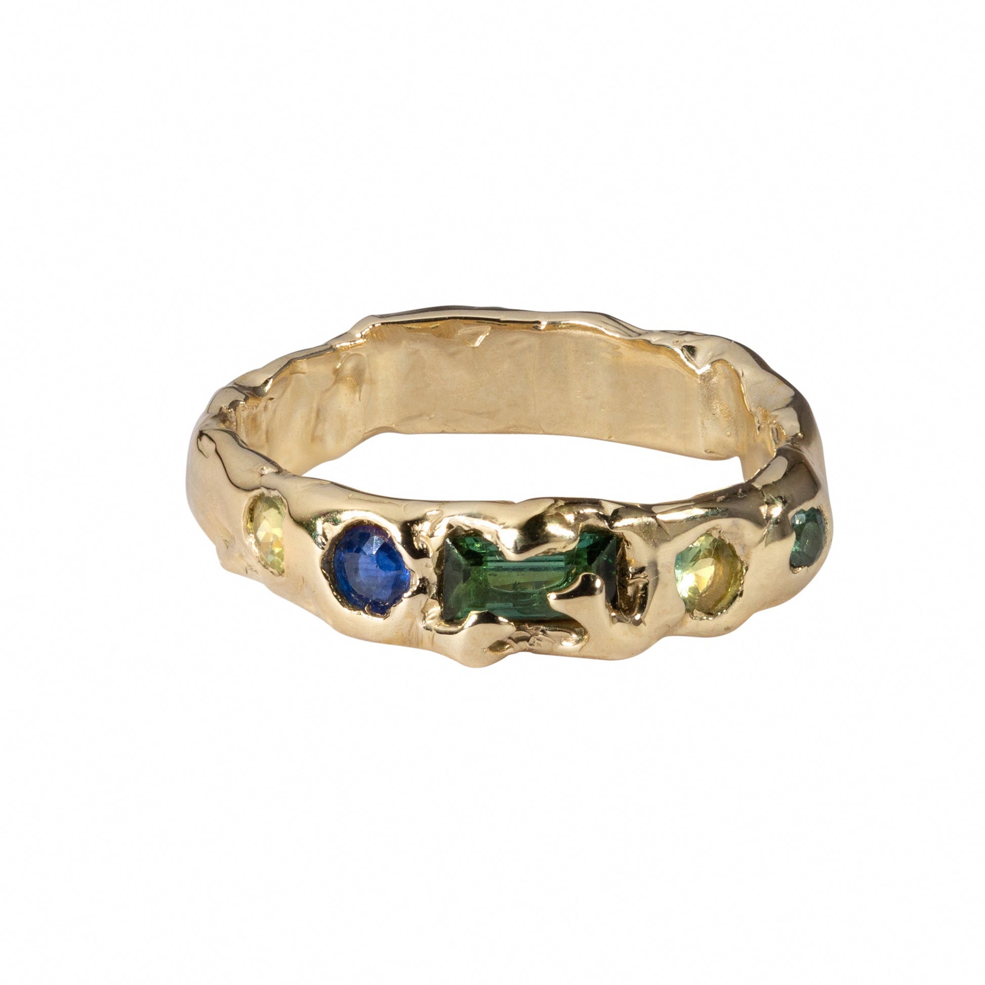 9kt gold ring with a centrepiece deep green tourmaline, with four circular sapphires in yellow, greens and blue.