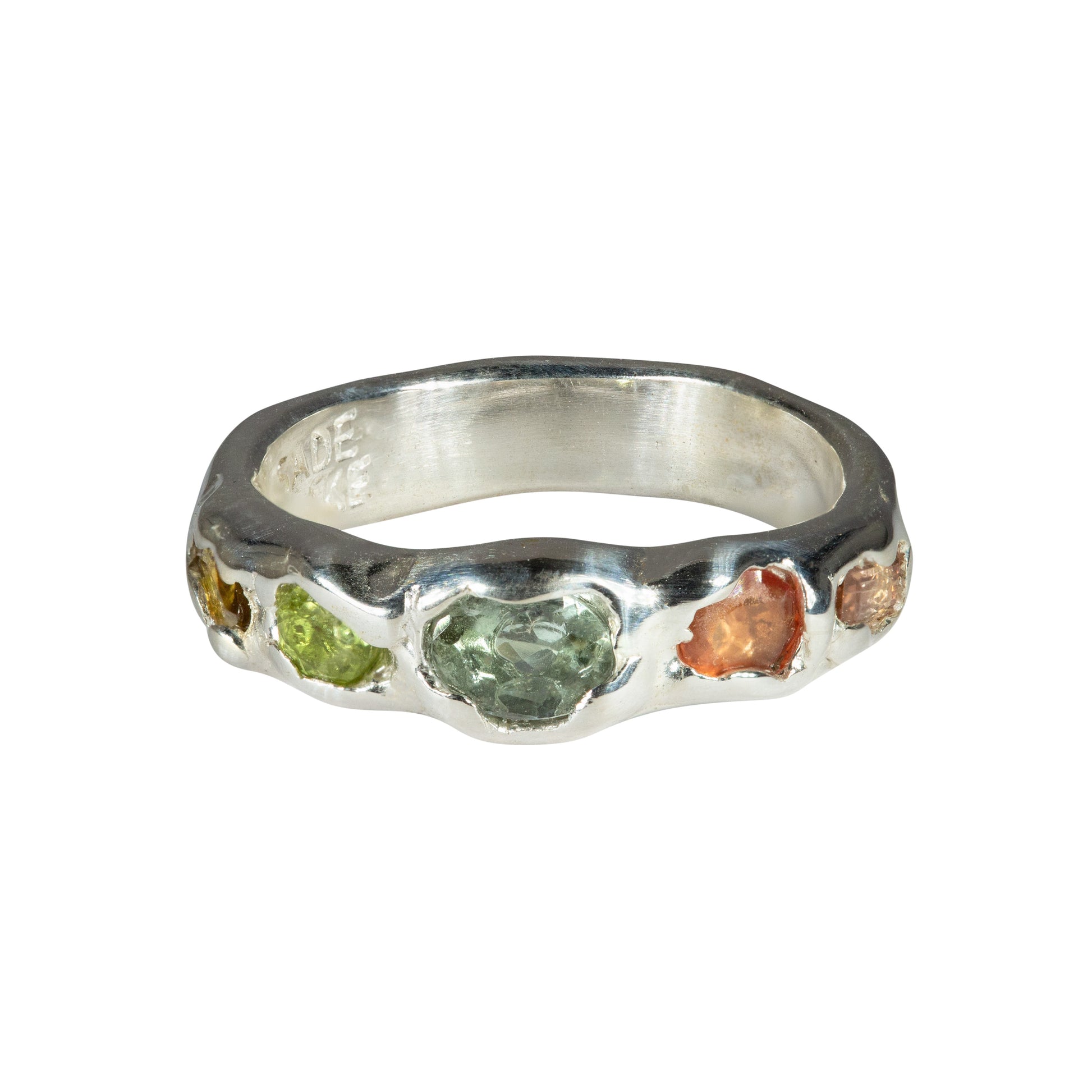 Sterling silver ring band with a central blue tourmaline, a burnt orange Spessartine garnet, a pale pink tourmaline, a bright green tourmaline, and a mossy green tourmaline.