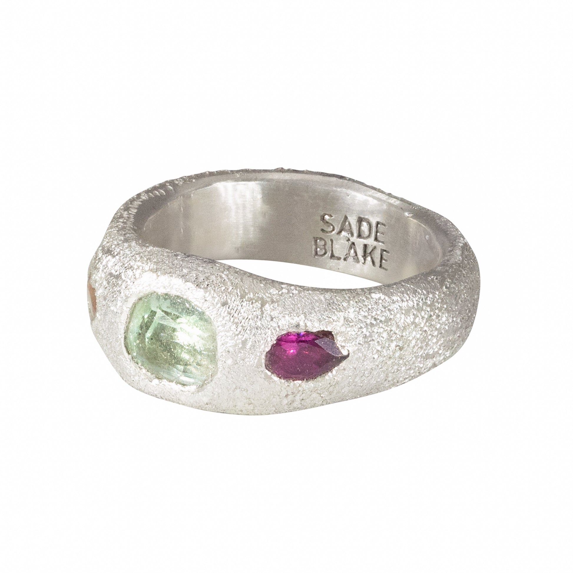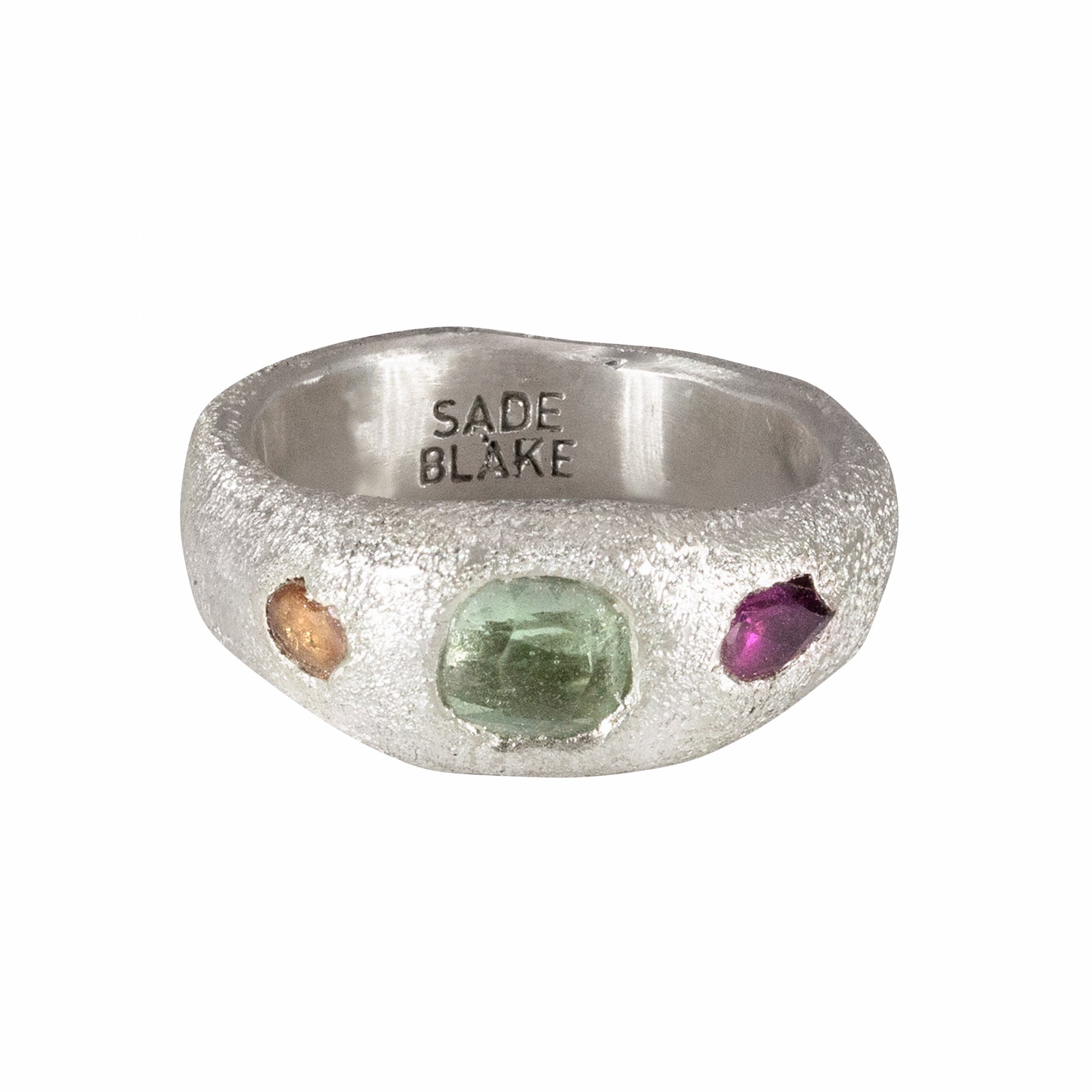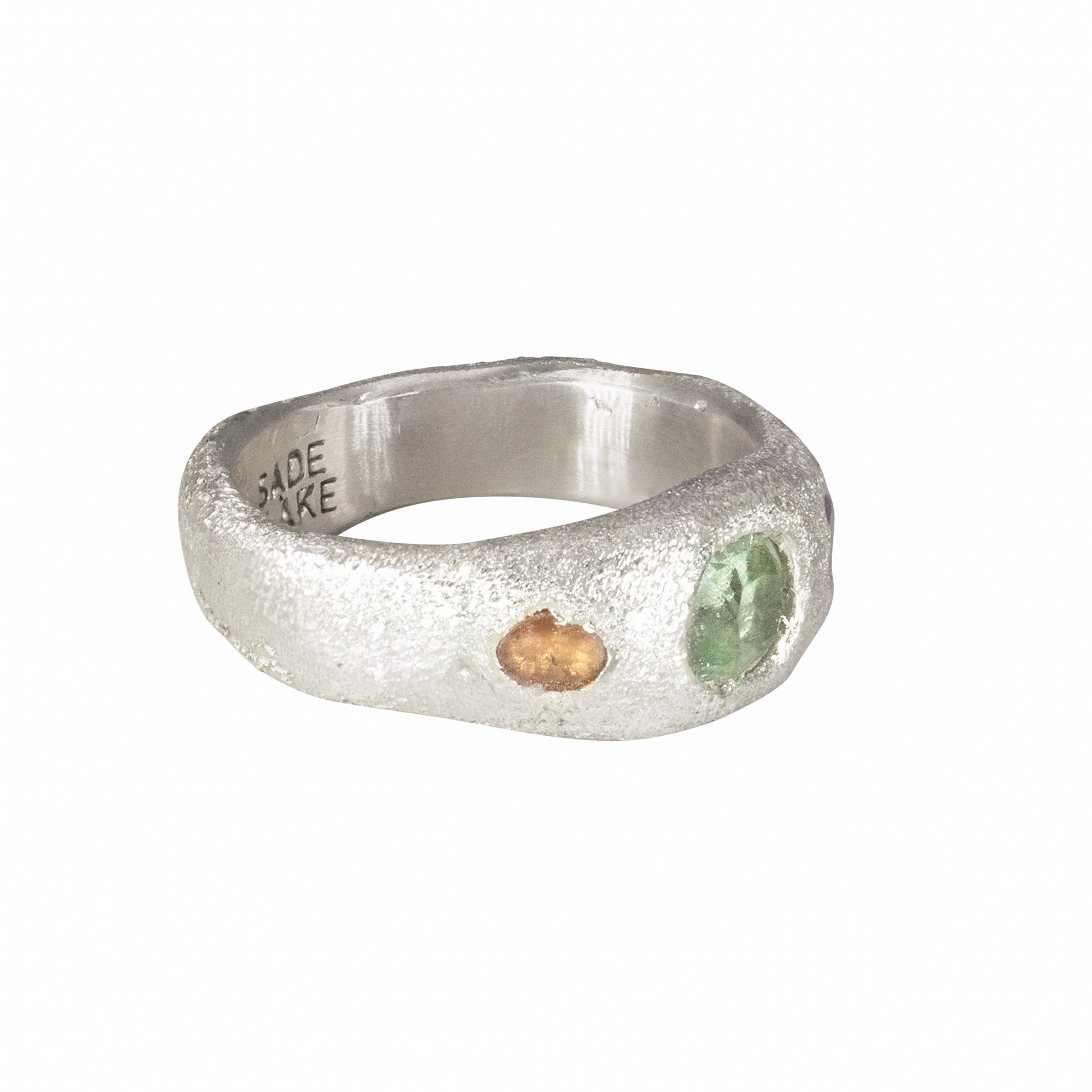 Textured chunky 925 sterling silver ring with a central cool green toned tourmaline, a burnt orange sapphire, and a grape garnet.