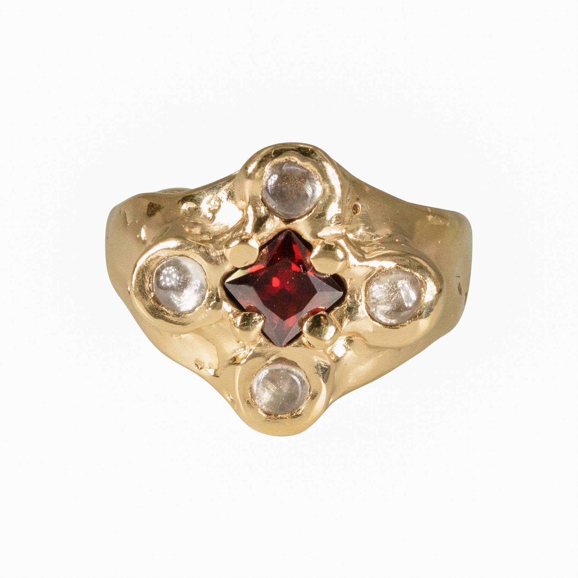 A Byzantinesque ring encasing four domed cabochon stones in a light peach colour. All surrounding a square cut deep red cubic zirconia. This ring is gold vermeil, 925 sterling silver with a chunky coating of 18kt gold.