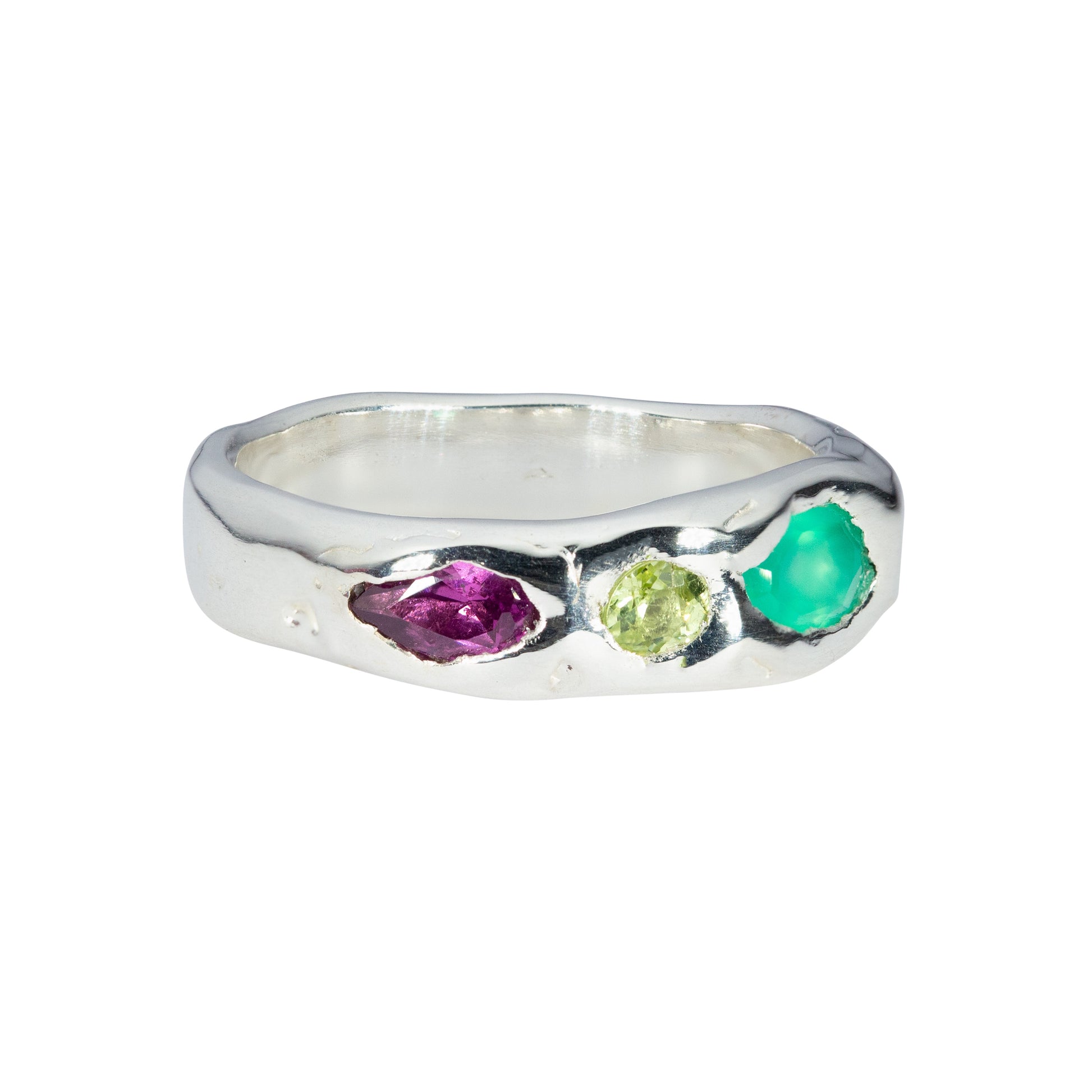 Sterling silver band with a central bright green agate, two dark pink sapphires, a round green peridot, and a light pink round tourmaline.