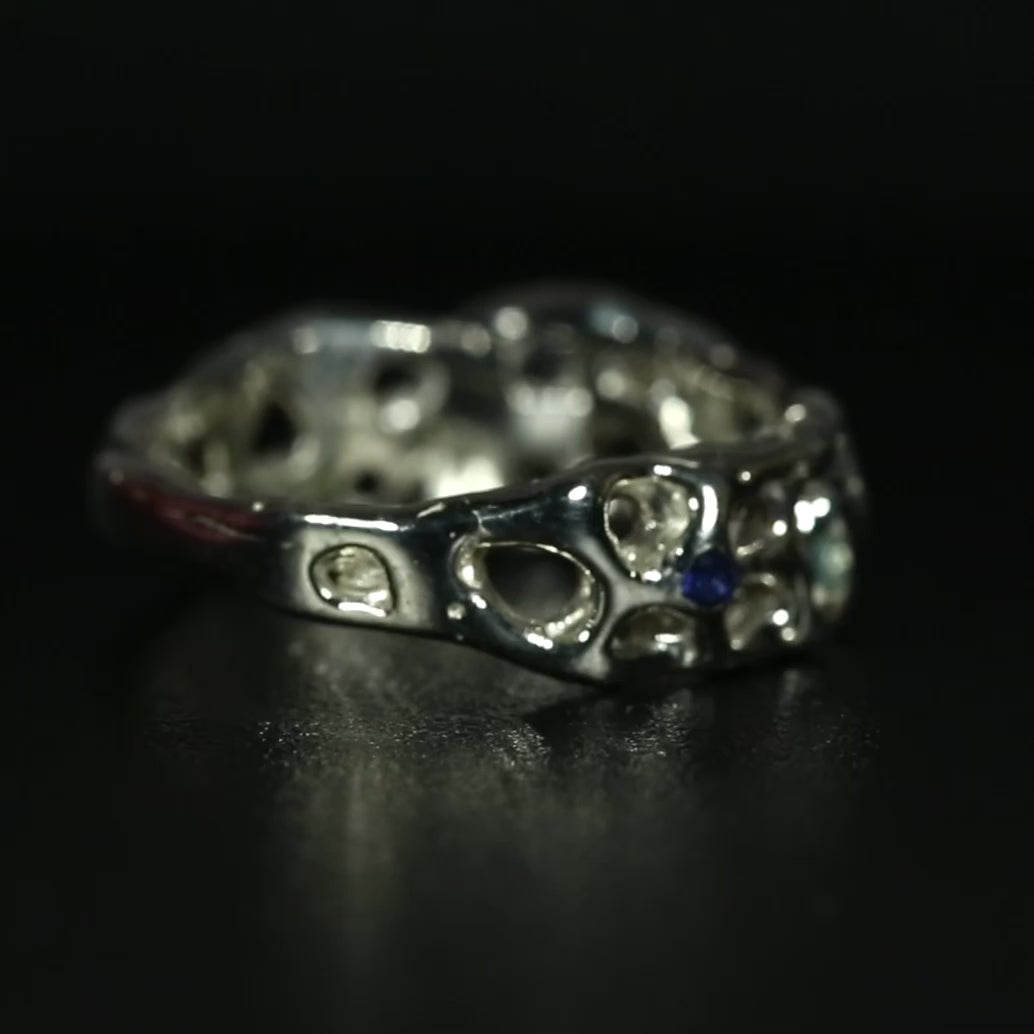 Sterling silver free-flowing vine ring encompassing deep blue sapphires, a lab diamond, a white round sapphire, and a baguette light blue topaz.