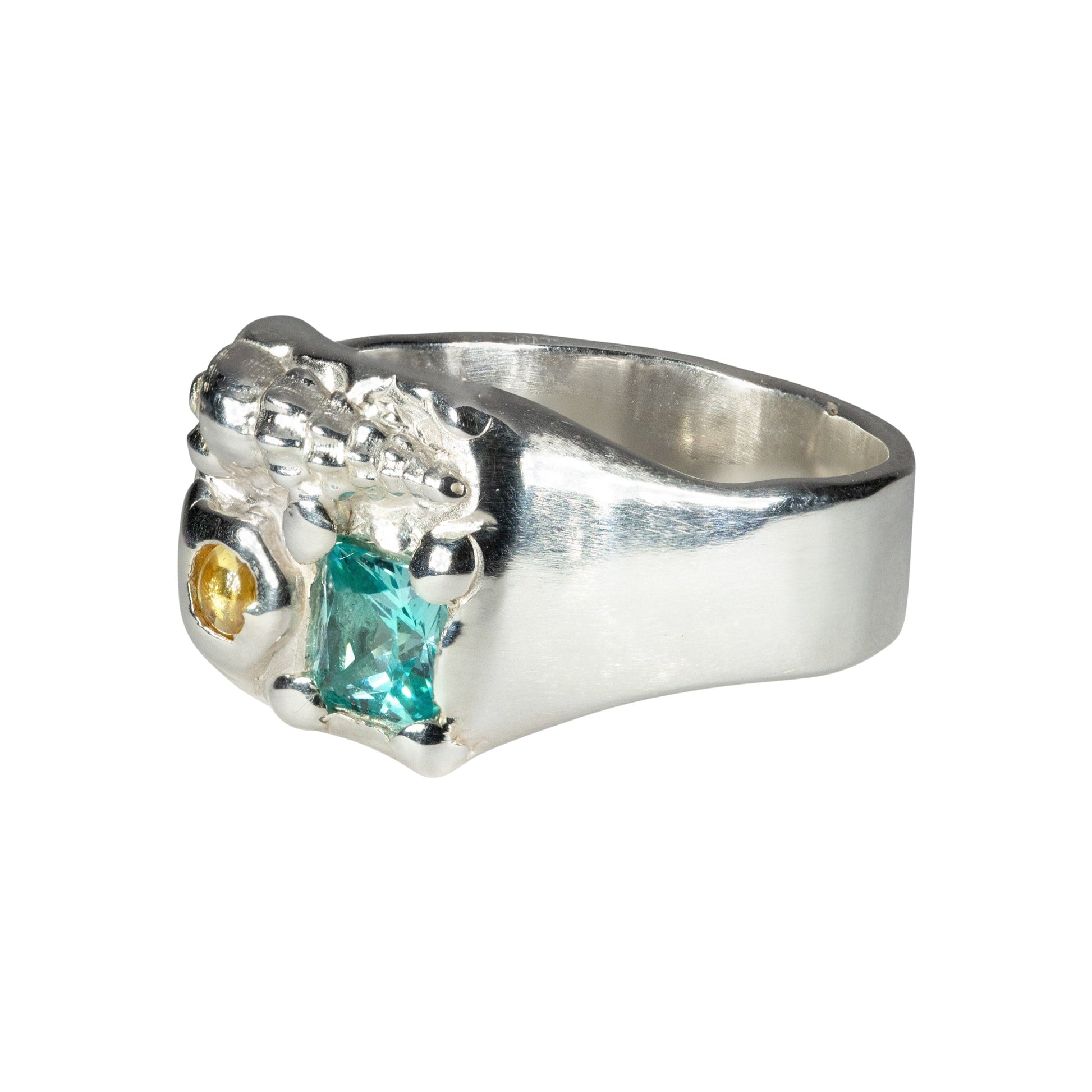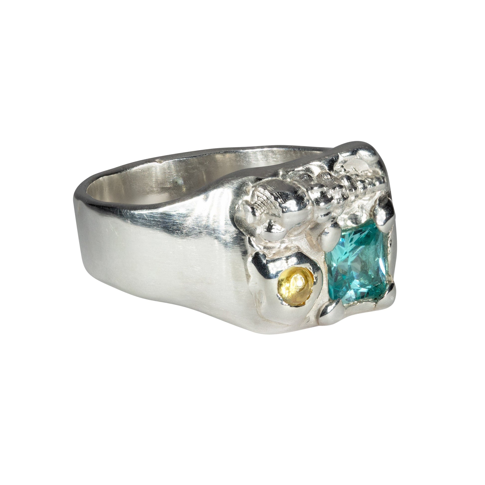 Sterling silver signet style ring with a a silver shell, a teal square cut cubic zirconia, and a yellow cabochon glass stone.