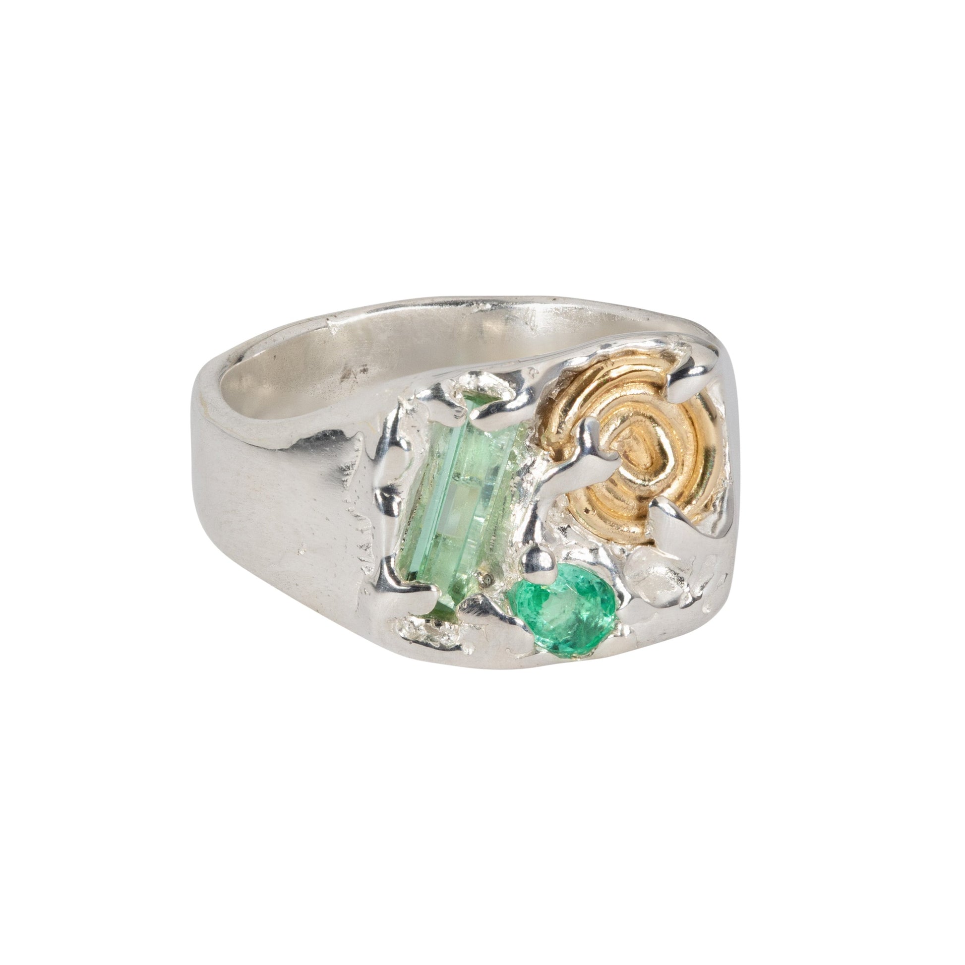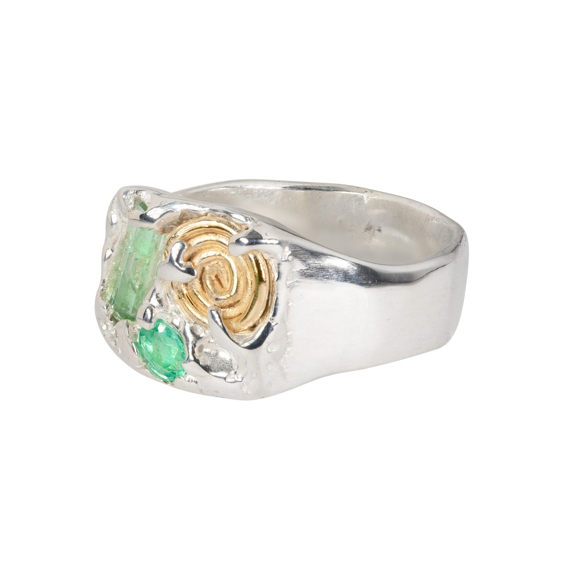 Sterling silver signet style ring with a 14kt solid gold spiral, a vivid green emerald, and a rectangular sea green tourmaline.