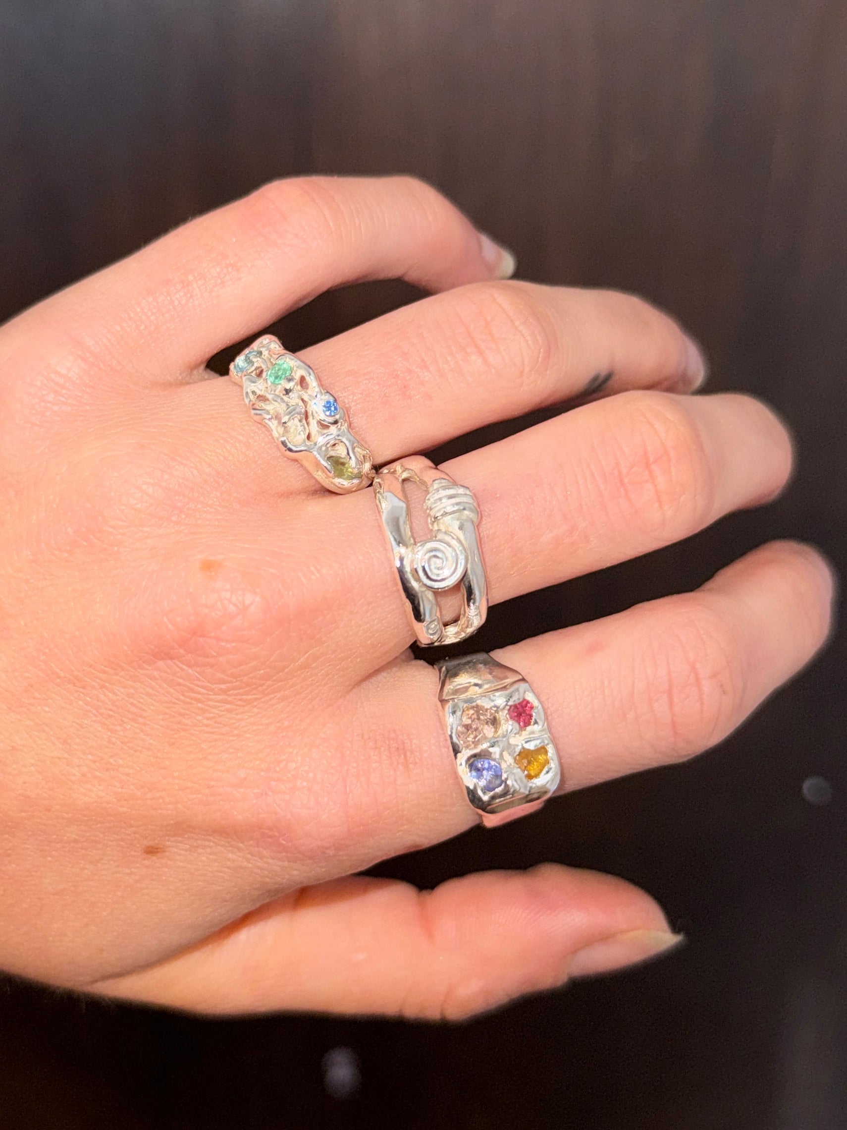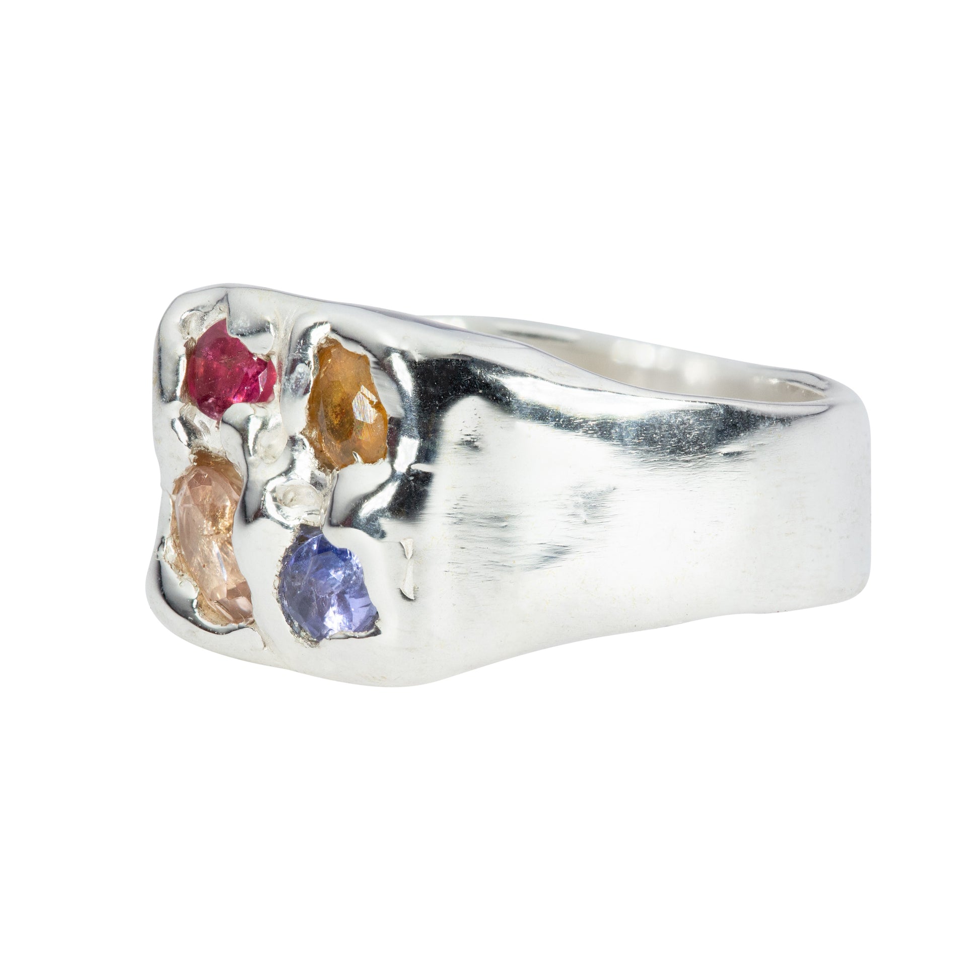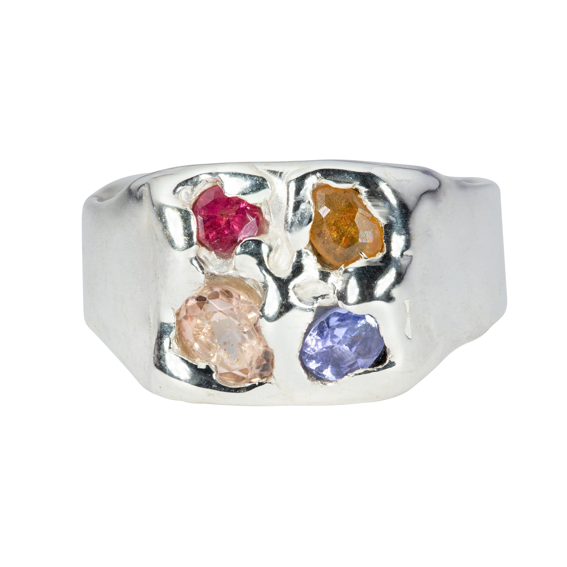 925 sterling silver textured signet style ring featuring 4 stones: a pink ruby, peach tourmaline, purple amethyst, and an orange sapphire.