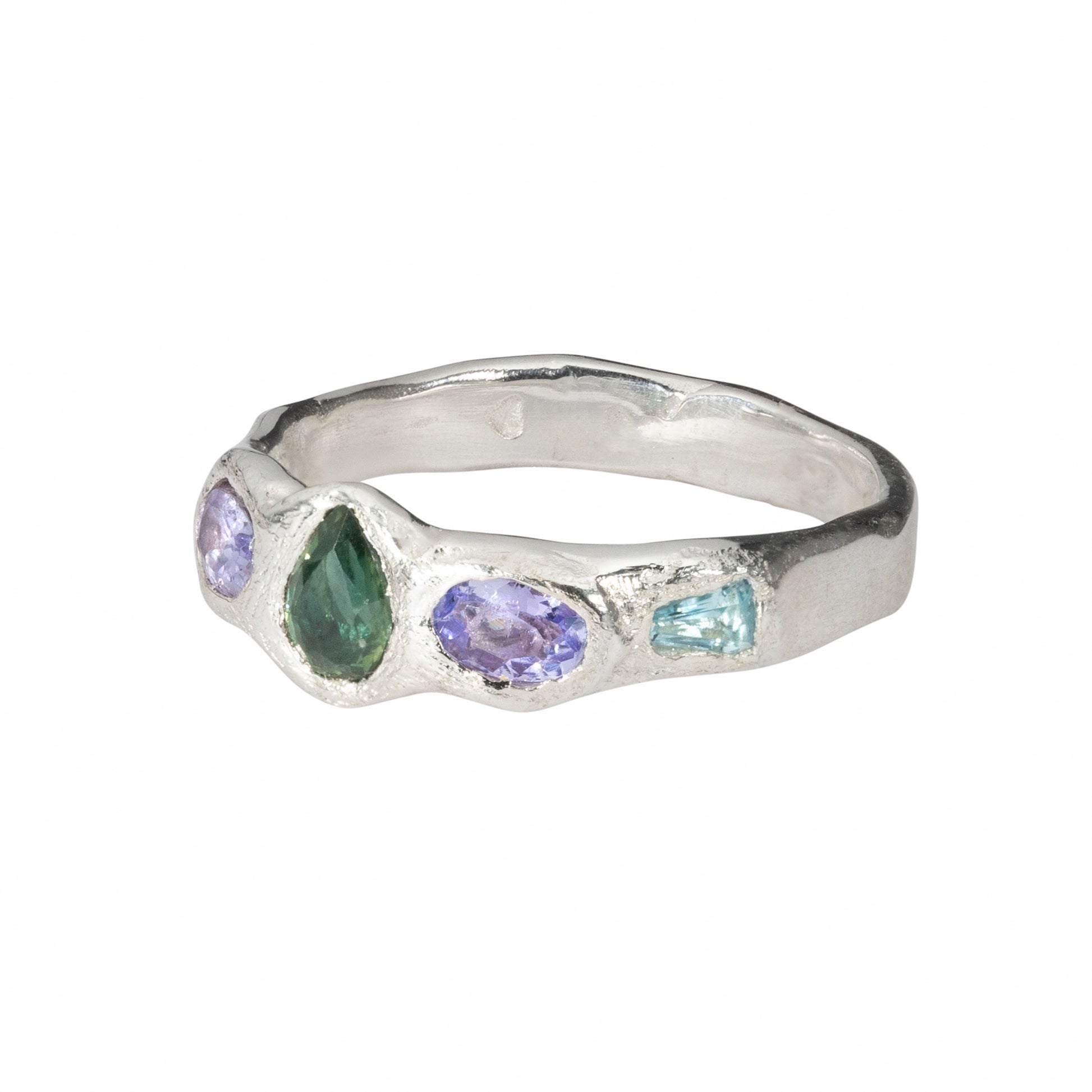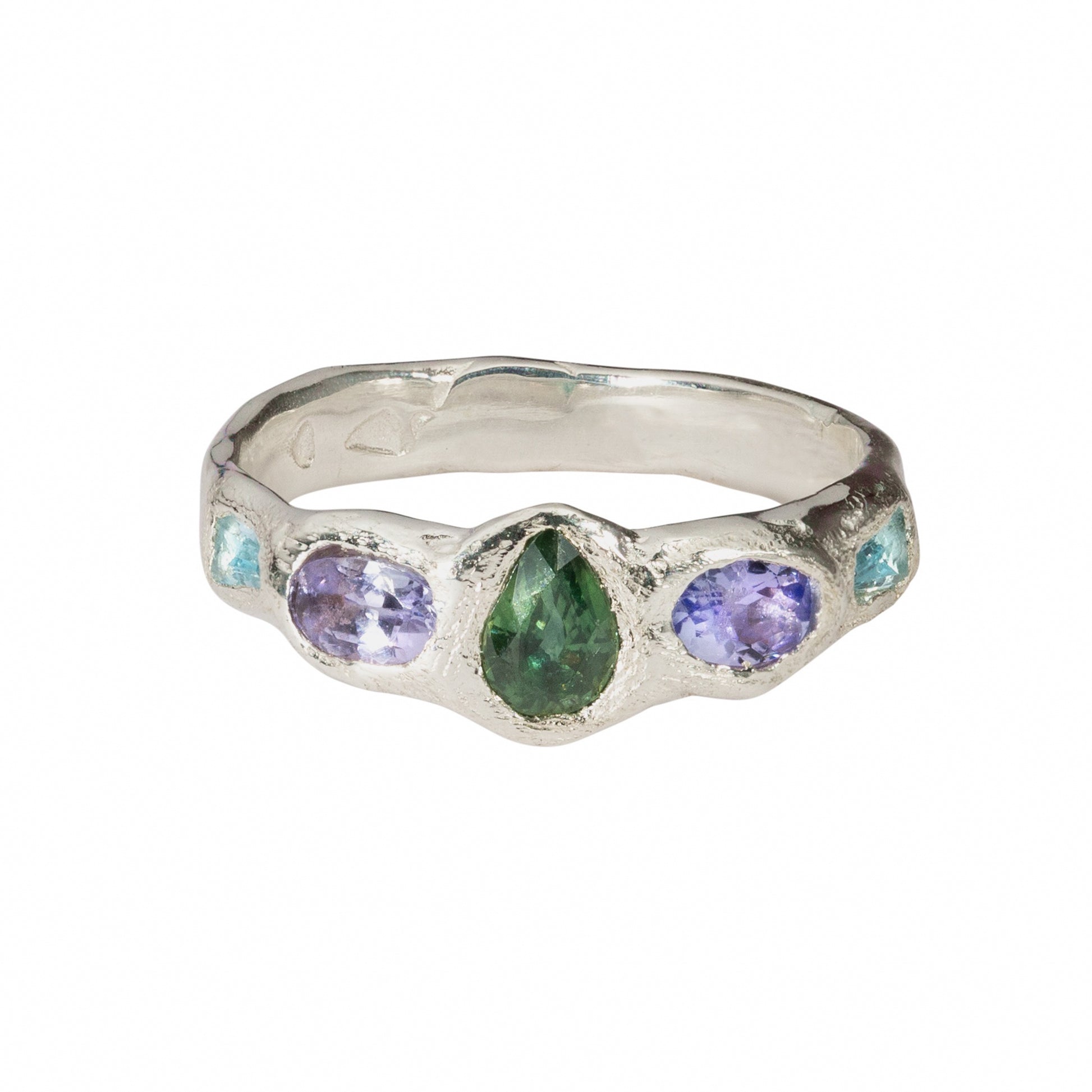 The teardrop ring contains 5 naturally occurring gemstones on a texture 925 sterling silver band. The teardrop shaped sapphire centrepiece pairs perfectly with two oval blue/purple tanzanite, and two natural sky blue topaz cut to a tapered shape.