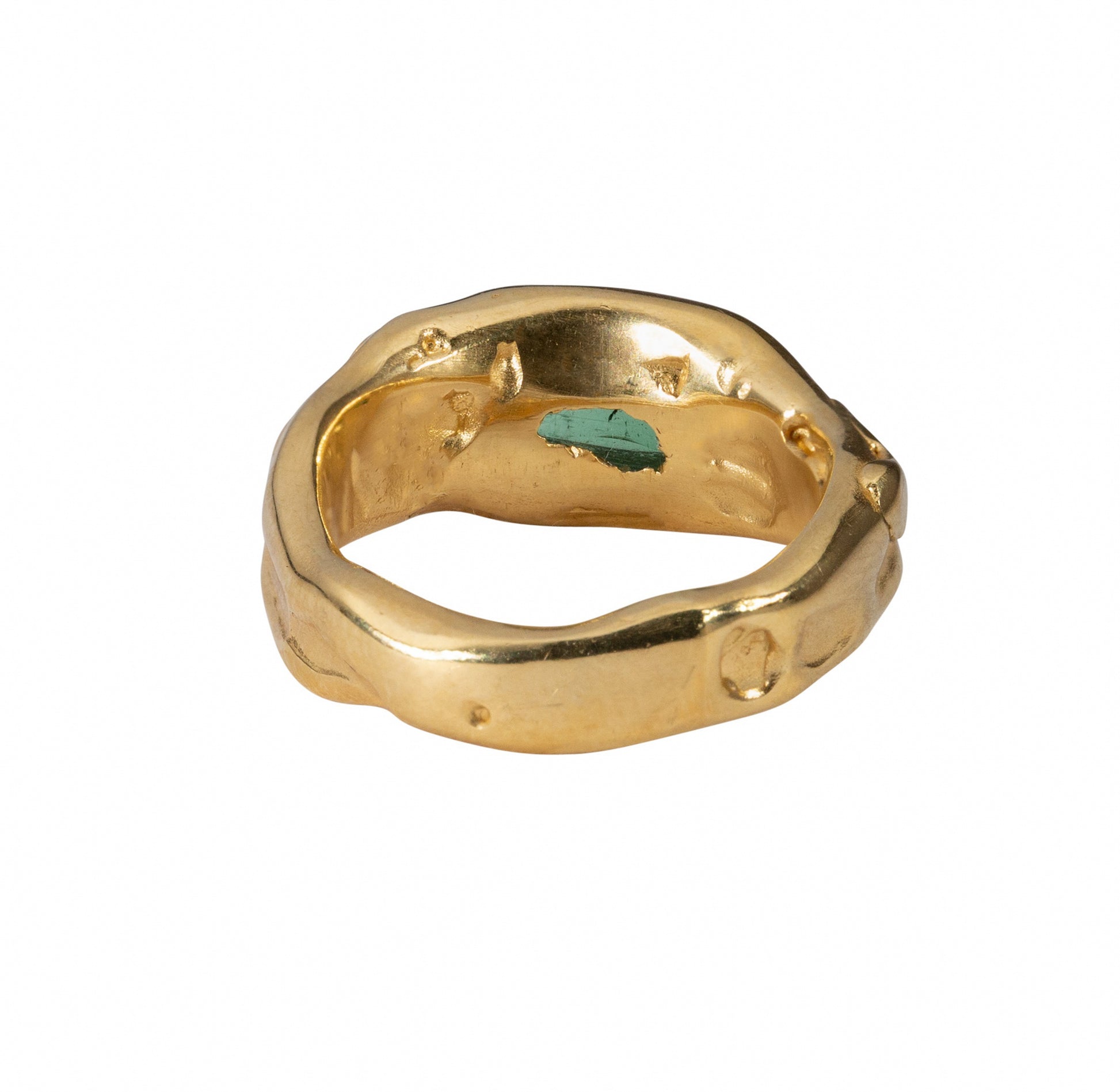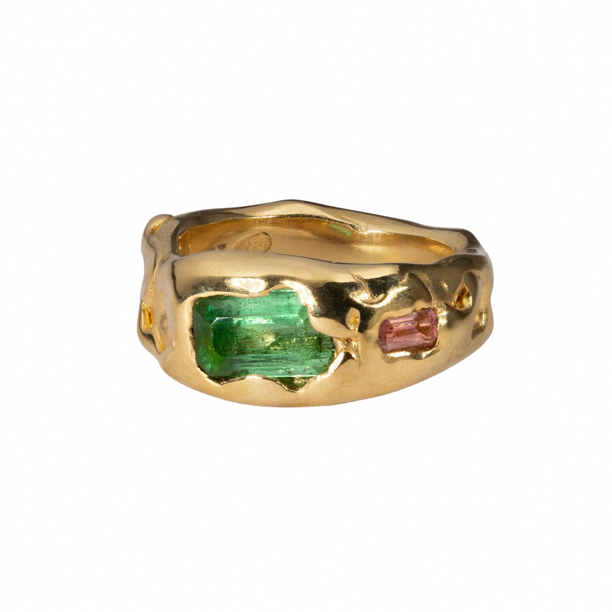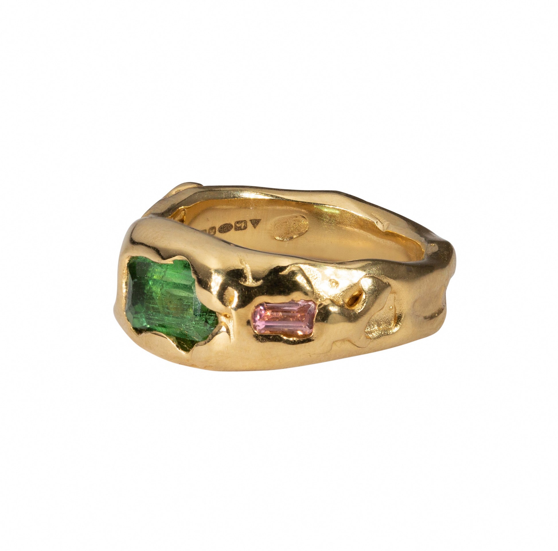 18kt gold vermeil ring with two natural tourmalines. One large striated green tourmaline, alongside a smaller pink one. This ring is a US size 5.75
